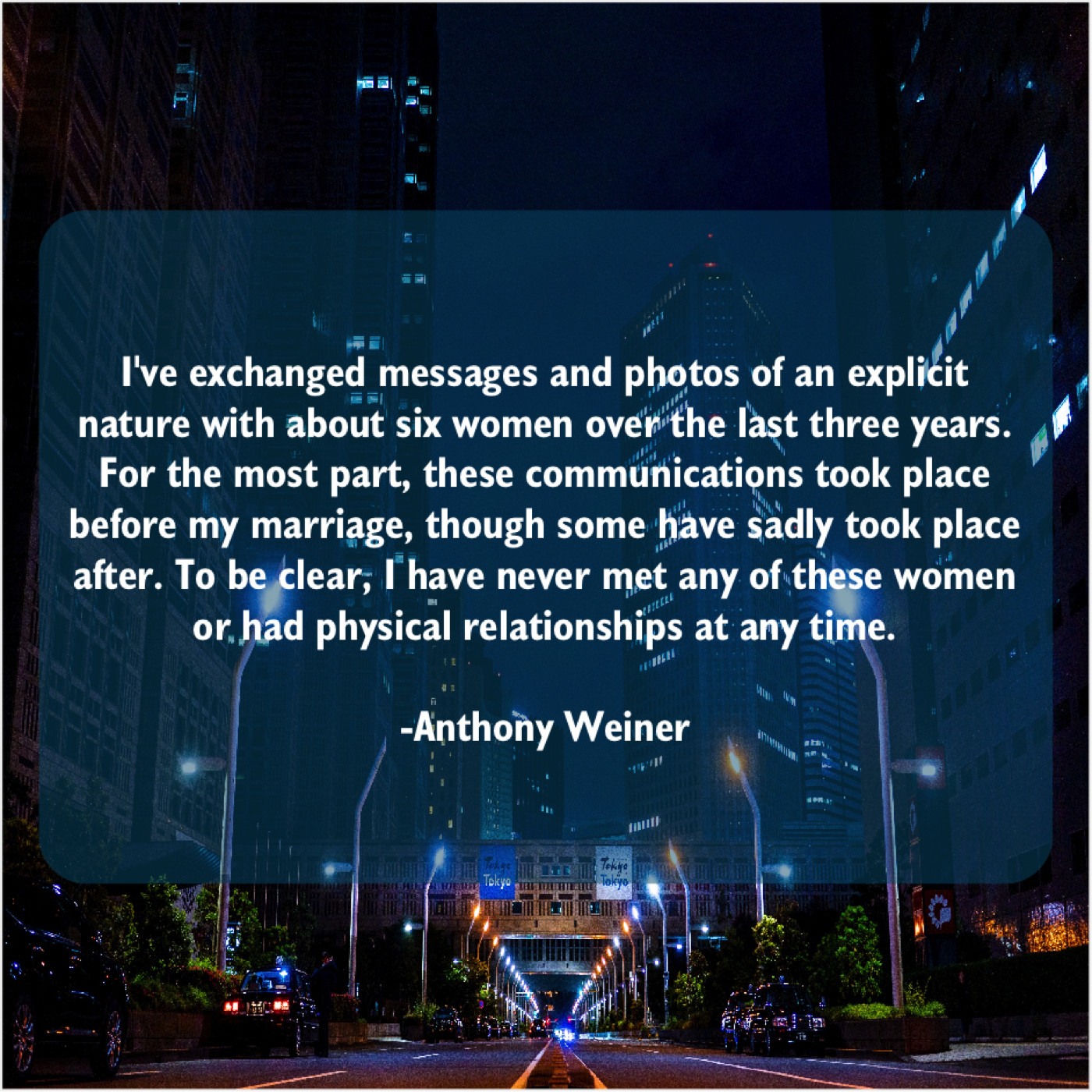 “I’ve exchanged messages and photos of an explicit nature with about six women over the last three years. For the most part, these communications took place before my marriage, though some have sadly took place after. To be clear, I have never met any of these women or had physical relationships at any time.”