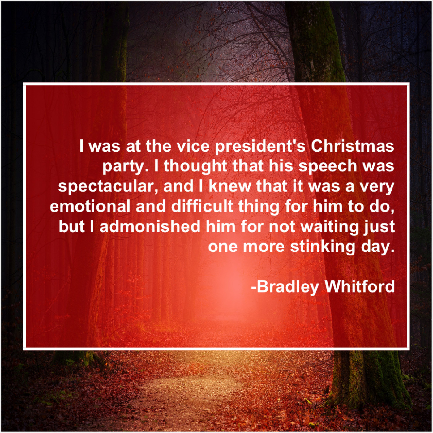 “I was at the vice president’s Christmas party. I thought that his speech was spectacular, and I knew that it was a very emotional and difficult thing for him to do, but I admonished him for not waiting just one more stinking day.”