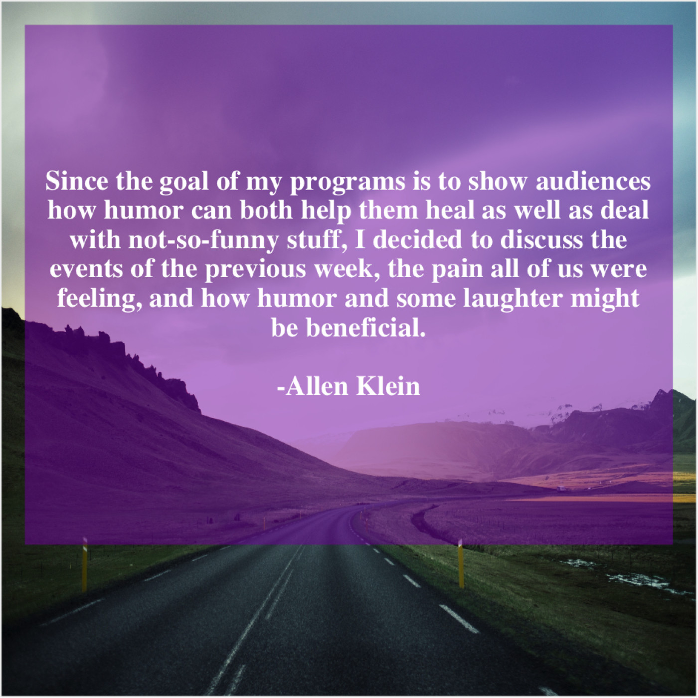 “Since the goal of my programs is to show audiences how humor can both help them heal as well as deal with not-so-funny stuff, I decided to discuss the events of the previous week, the pain all of us were feeling, and how humor and some laughter might be beneficial.”