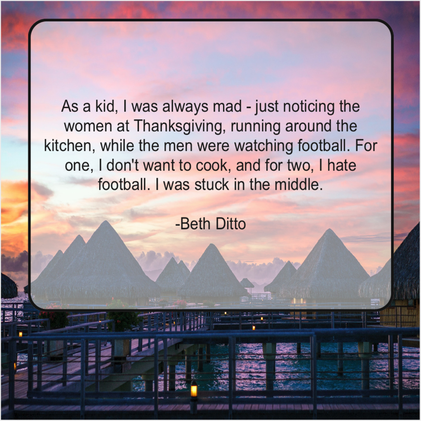 “As a kid, I was always mad – just noticing the women at Thanksgiving, running around the kitchen, while the men were watching football. For one, I don’t want to cook, and for two, I hate football. I was stuck in the middle.”