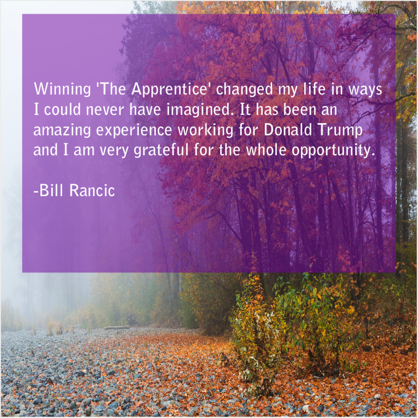“Winning ‘The Apprentice’ changed my life in ways I could never have imagined. It has been an amazing experience working for Donald Trump and I am very grateful for the whole opportunity.”