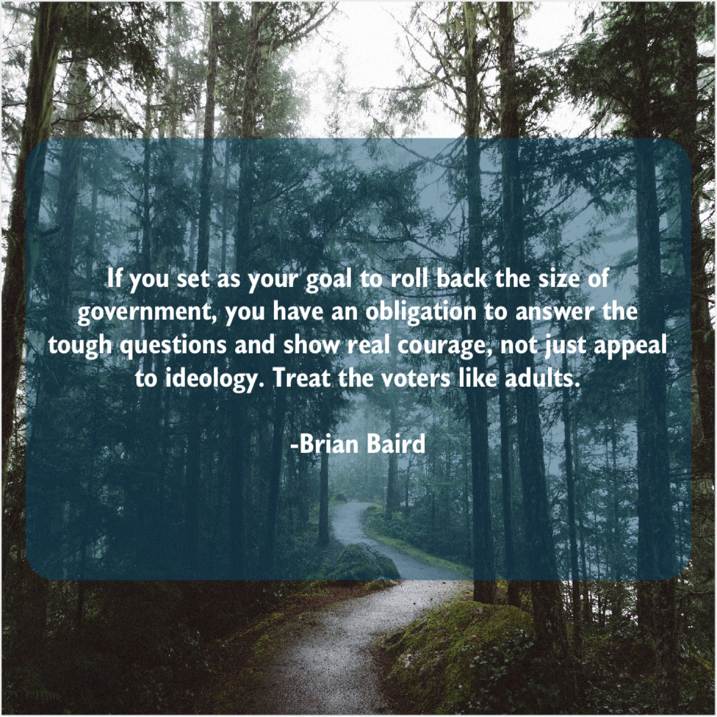 “If you set as your goal to roll back the size of government, you have an obligation to answer the tough questions and show real courage, not just appeal to ideology. Treat the voters like adults.”