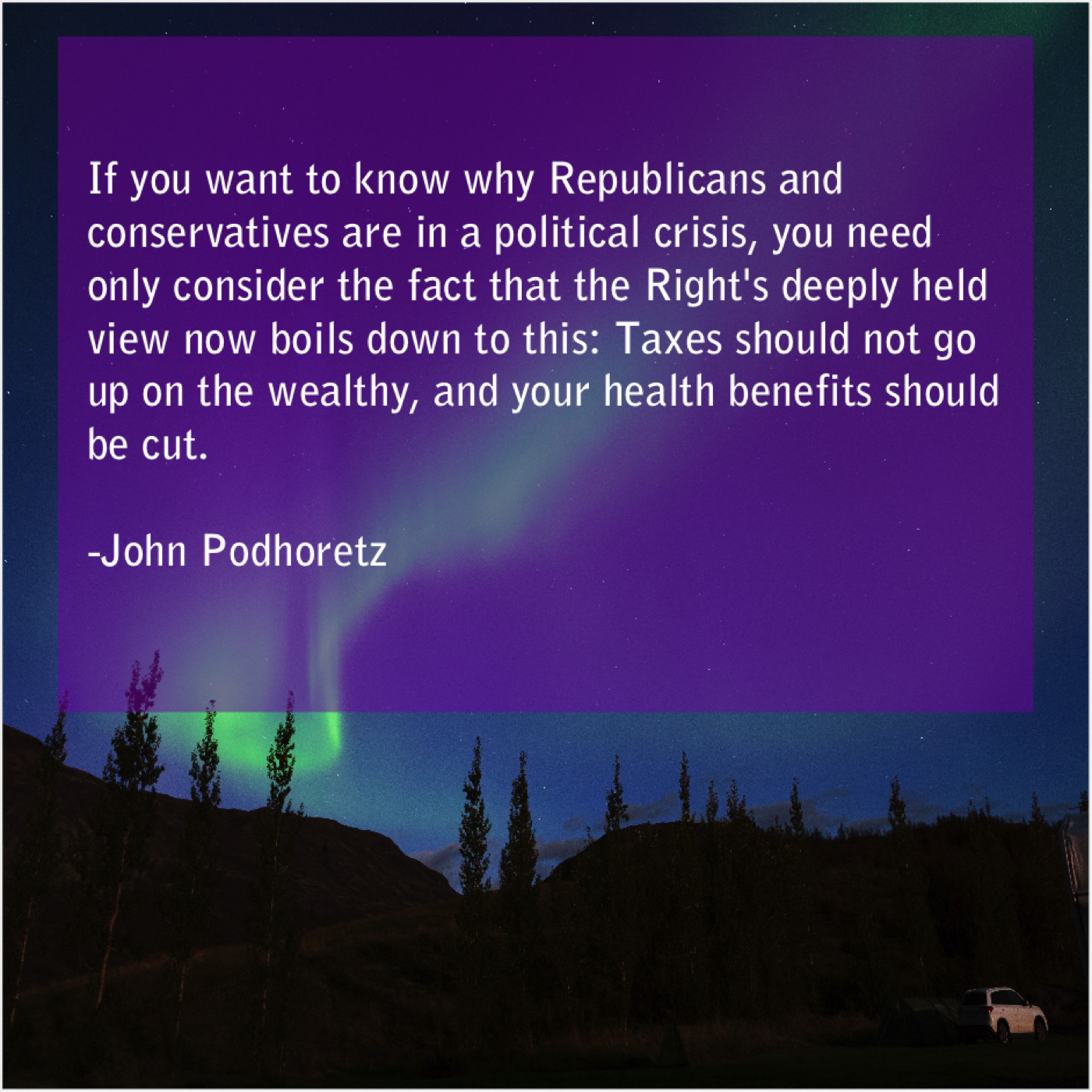 “If you want to know why Republicans and conservatives are in a political crisis, you need only consider the fact that the Right’s deeply held view now boils down to this: Taxes should not go up on the wealthy, and your health benefits should be cut.”