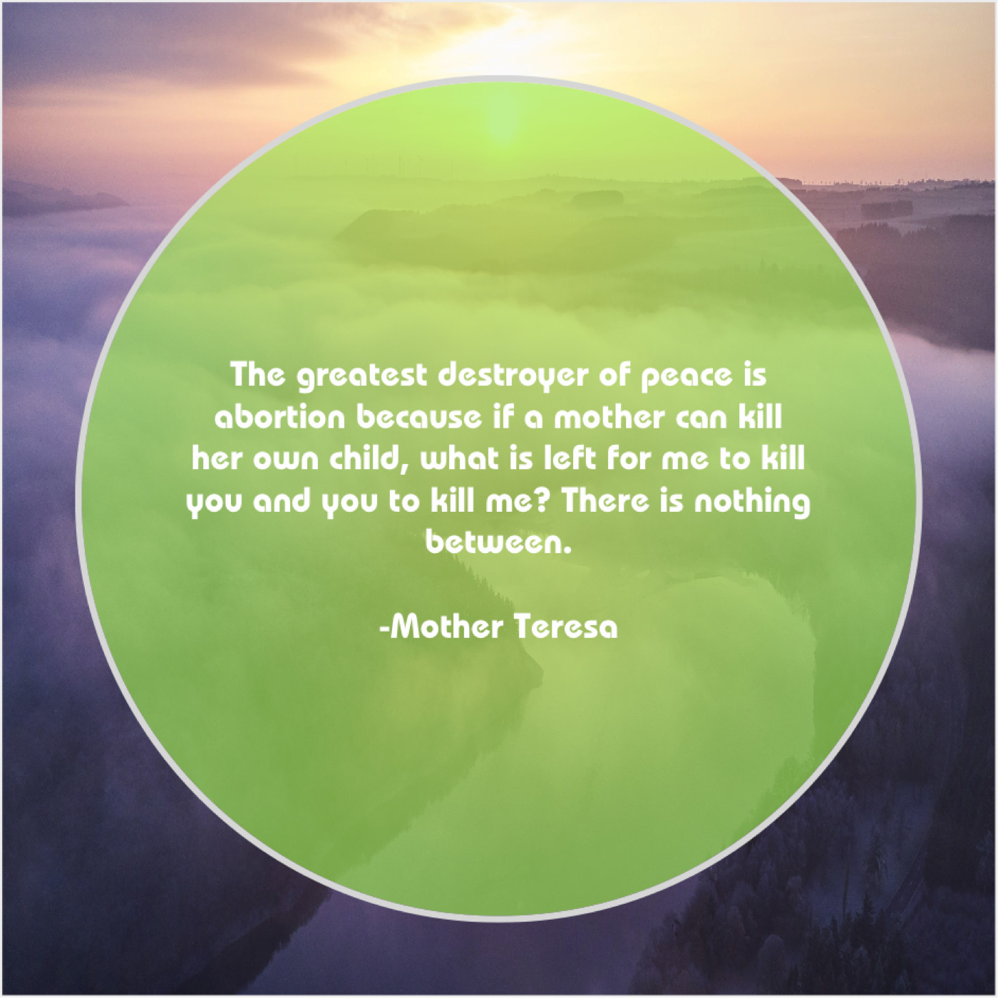 “The greatest destroyer of peace is abortion because if a mother can kill her own child, what is left for me to kill you and you to kill me? There is nothing between.”