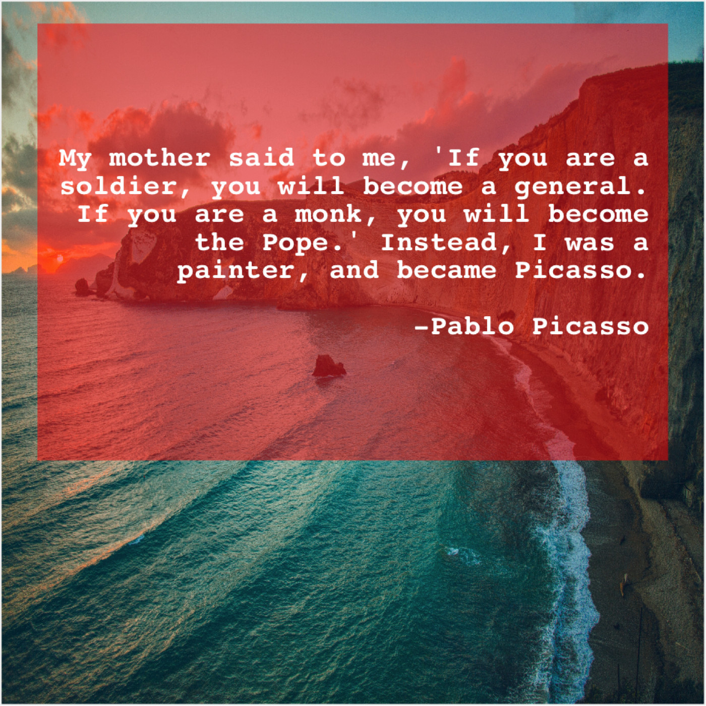 “My mother said to me, ‘If you are a soldier, you will become a general. If you are a monk, you will become the Pope.’ Instead, I was a painter, and became Picasso.”